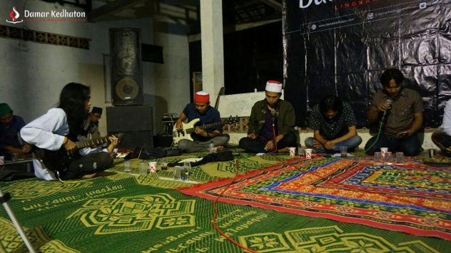 Menjelang pukul 19.23, satu-persatu dulur JMDK mulai berdatangan. Terasa surprise ketika dulur dari Driyorejo yaitu Cak Rezky dan Cak Haqiqi datang dengan membawa 4 buah Damar Kurung dengan desain ala DK yang mereka buat pada siang harinya dengan bantuan Cak Bayu. Tanpa berpikir panjang, dulur yang sudah hadir di lokasi langsung berinisiatif memasang Damar Kurung pada langit-langit teras musholla. (Berita tentang Damar Kurung ini bisa dibaca di http://damarkedhaton.com/2017/06/20/damar-kurung-ala-damar-kedhaton-di-tlogobedah/ )
