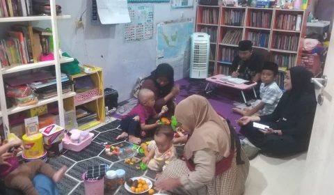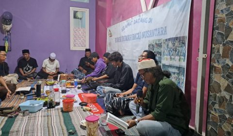 Sebelum Majelis Ilmu Telulikuran dimulai, tampak dua forum kecil yang berlangsung terpisah. Para bapak berkumpul di area halaman Rumba Nusantara, sementara para ibu berada di ruang tamu lesehan yang dipenuhi rak buku dengan aneka rupa genre.