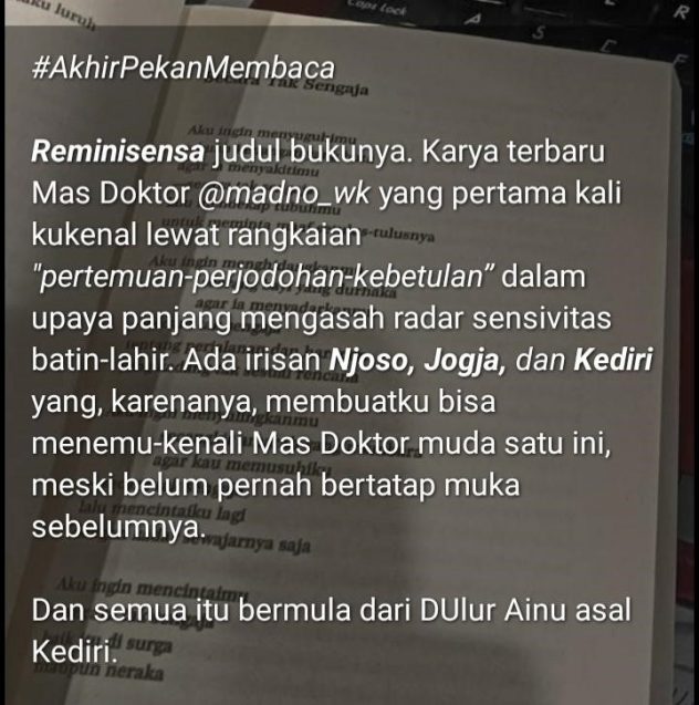Secara Tak Sengaja. Demikian judul salah satu puisi karya Mas @madno_wk dalam buku terbarunya, Reminisensa.